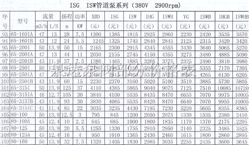 以下是我公司管道泵的部分價格表